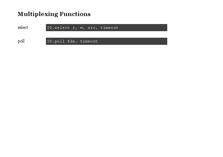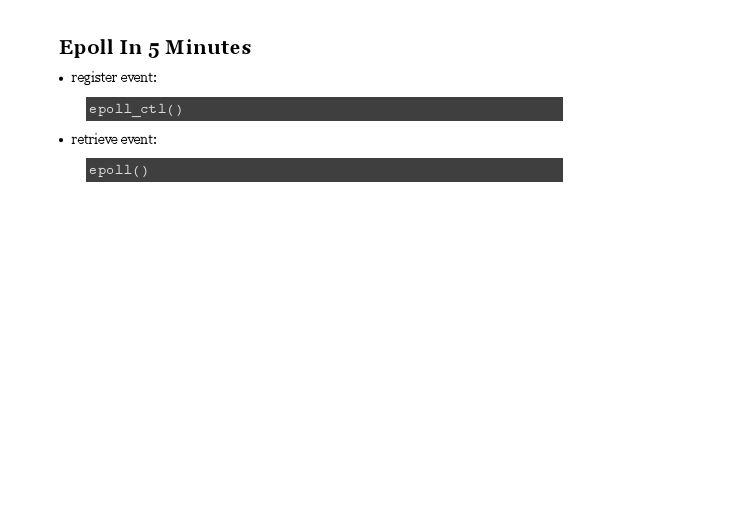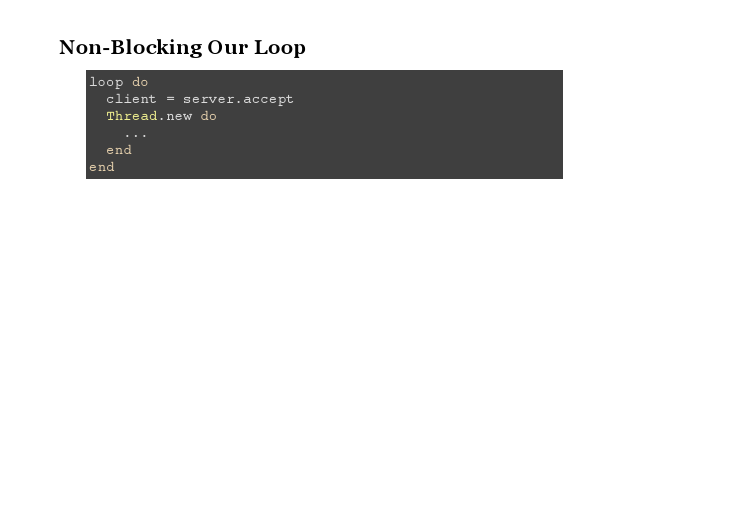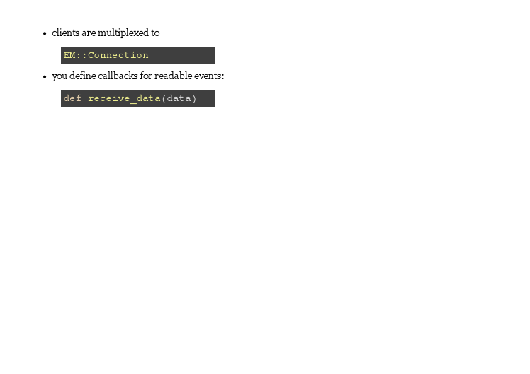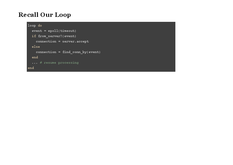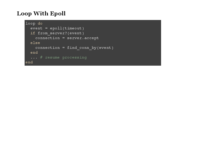 loop do event = epoll(timeout) if from_server?(event) connection = server.accept else connection = find_conn_by(event) end ... # resume processing
