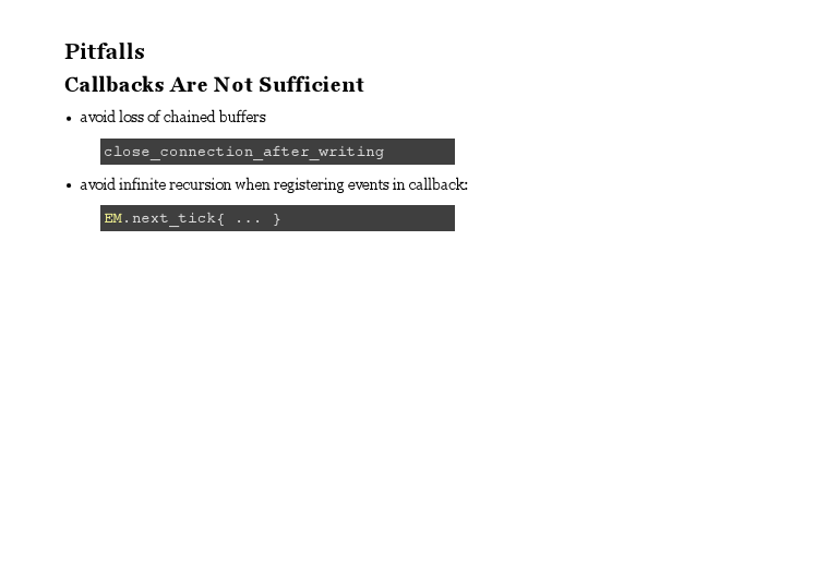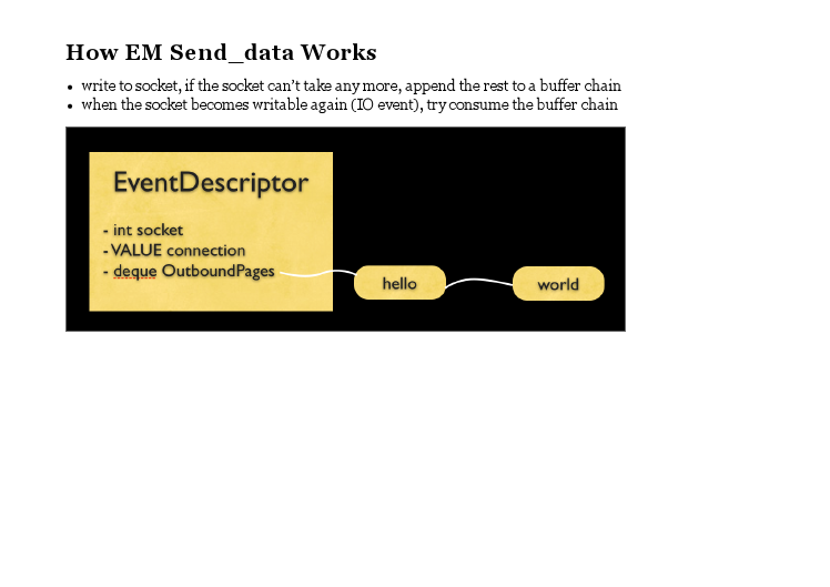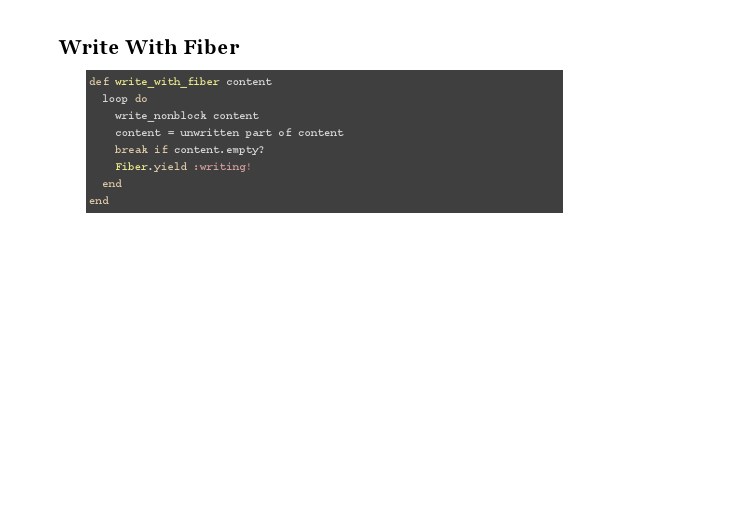 def write_with_fiber content loop do write_nonblock content content = unwritten part of content break if content.empty? Fiber.yield :writing! end