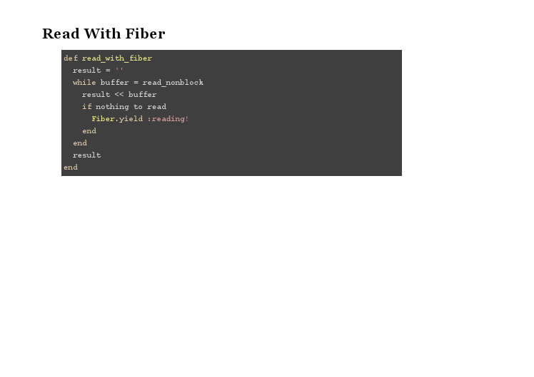def read_with_fiber result = '' while buffer = read_nonblock result << buffer if nothing to read Fiber.yield :reading! end end result