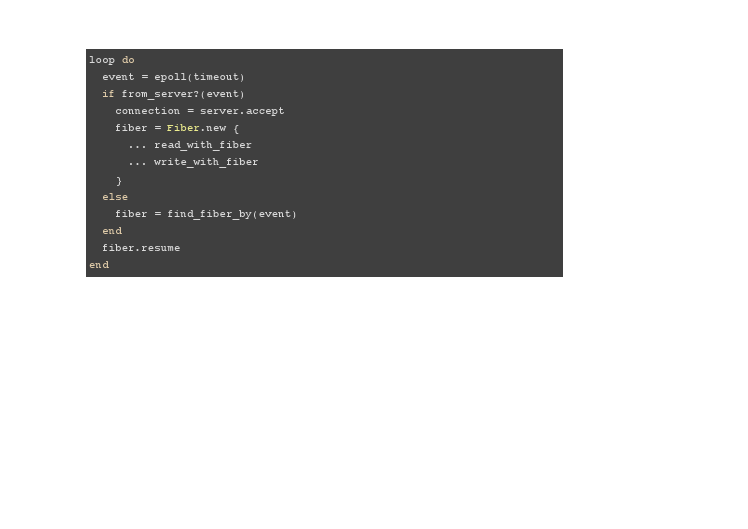 loop do event = epoll(timeout) if from_server?(event) connection = server.accept fiber = Fiber.new { ... read_with_fiber ... write_with_fiber } else fiber = find_fiber_by(event) end fiber.resume