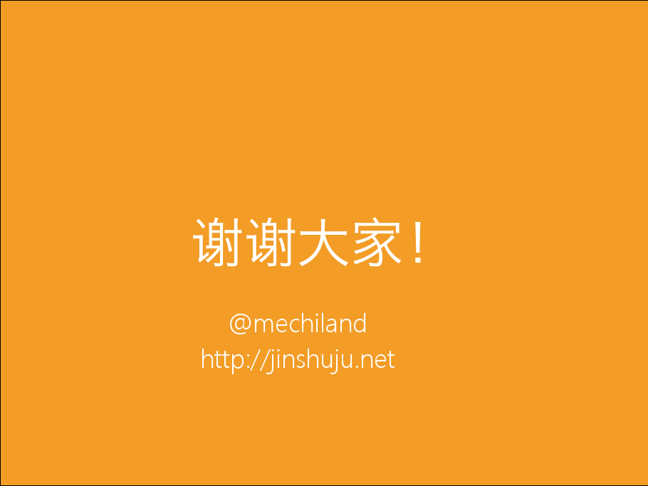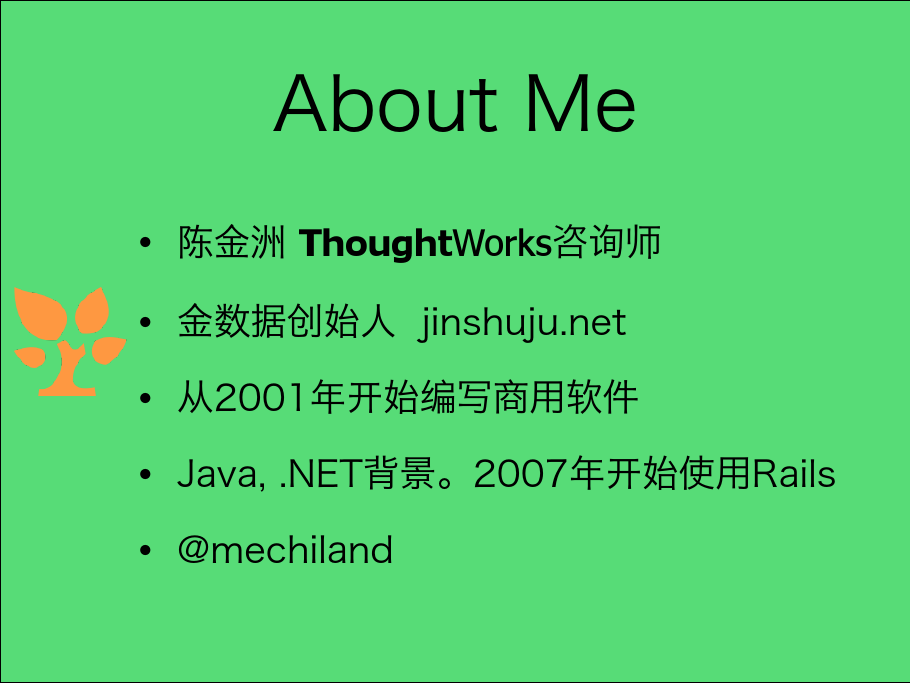 ·陈金洲 ThoughtWorks咨询师 ·金数据创始人 jinshuju.net ·从2001年开始编写商用软件 ·Java, .NET背景。2007年开始使用Rails ·@mechiland