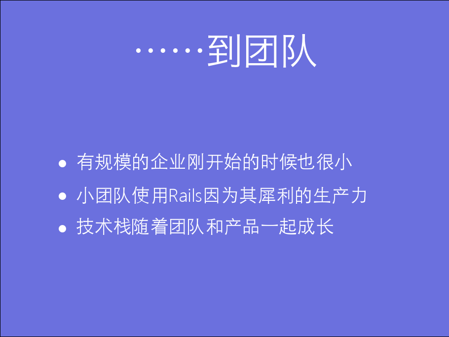 • 有规模的企业刚开始的时候也很⼩小 • ⼩小团队使⽤用Rails因为其犀利的⽣生产⼒力 • 技术栈随着团队和产品⼀一起成⻓长