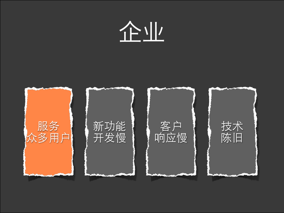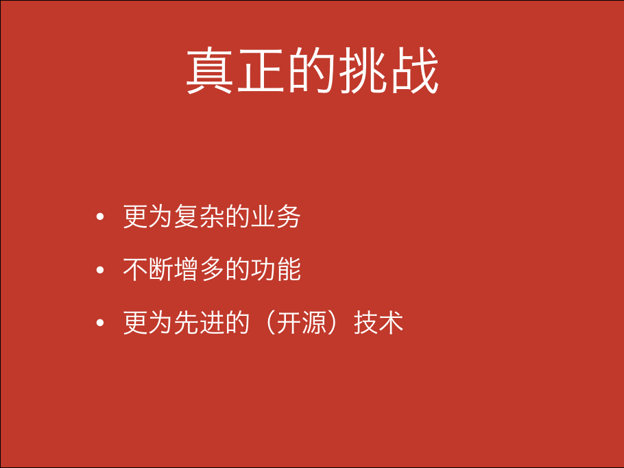 ·更为复杂的业务 ·不断增多的功能 ·更为先进的(开源)技术