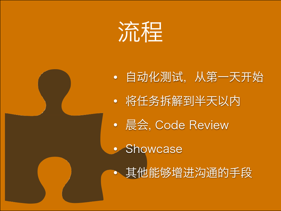 ·自动化测试,从第一天开始 ·将任务拆解到半天以内 ·晨会, Code Review ·Showcase ·其他能够增进沟通的手段