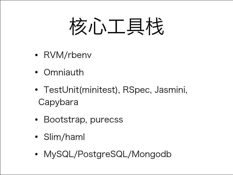 ·Bootstrap, purecss ·Slim/haml ·MySQL/PostgreSQL/Mongodb
