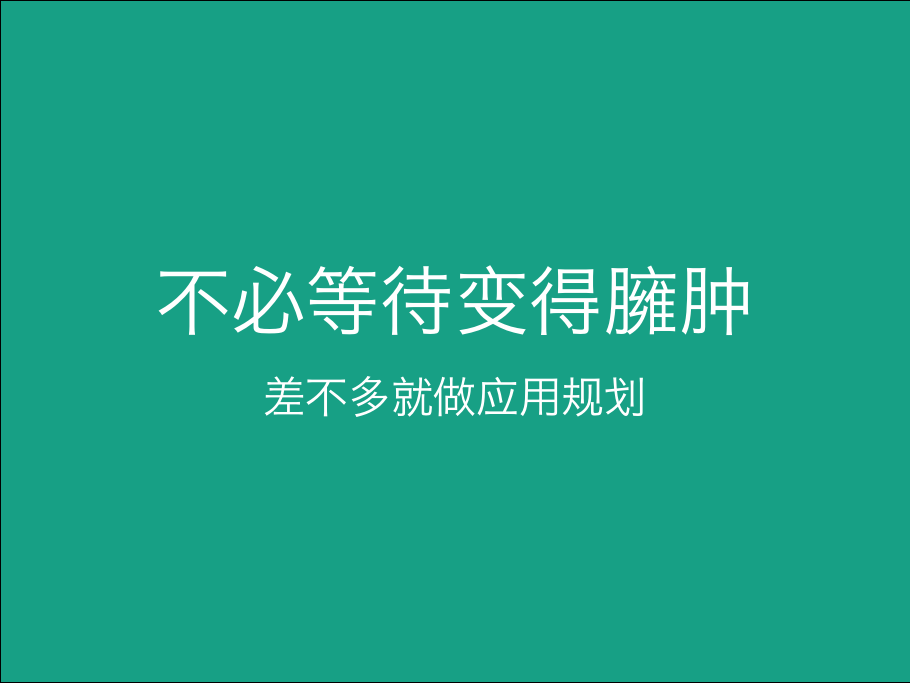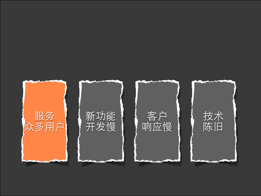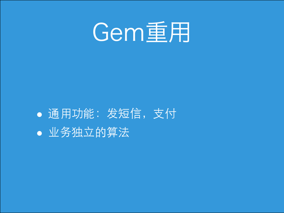 ·小团队,注重交流 ·限制系统的规模(代码行数) ·在恰当的时候对系统进行规划和拆分 ·通过Gem进行功能重用 ·通过API进行数据重用 ·通过消息服务进行系统间主动通信