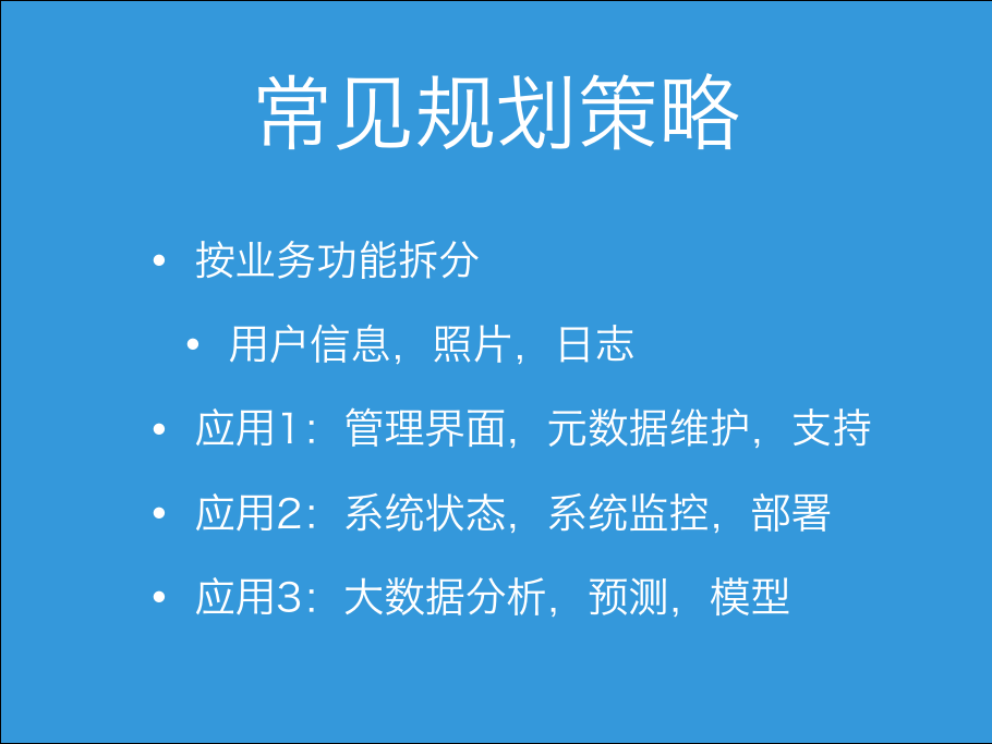 ·按业务功能拆分 ·用户信息,照片,日志 ·应用1:管理界面,元数据维护,支持 ·应用2:系统状态,系统监控,部署 ·应用3:大数据分析,预测,模型