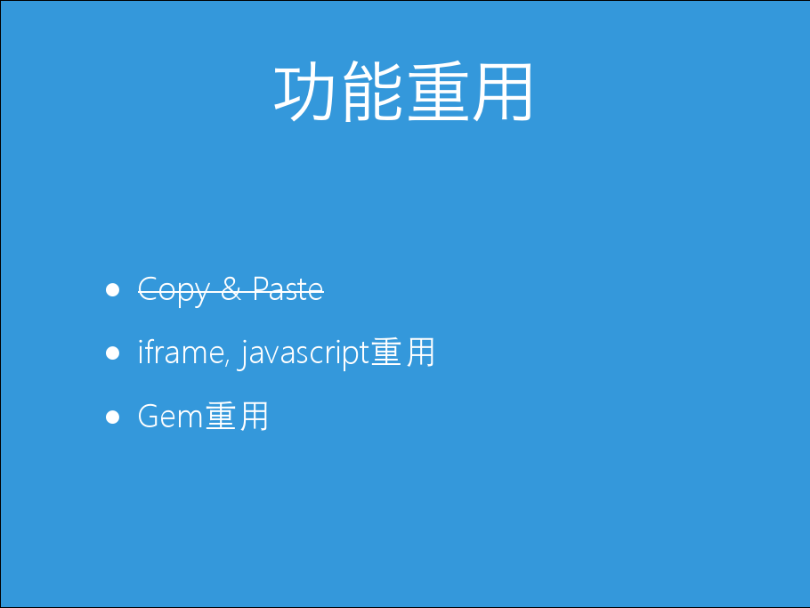 • Copy & Paste • iframe, javascript重⽤用 • Gem重⽤用