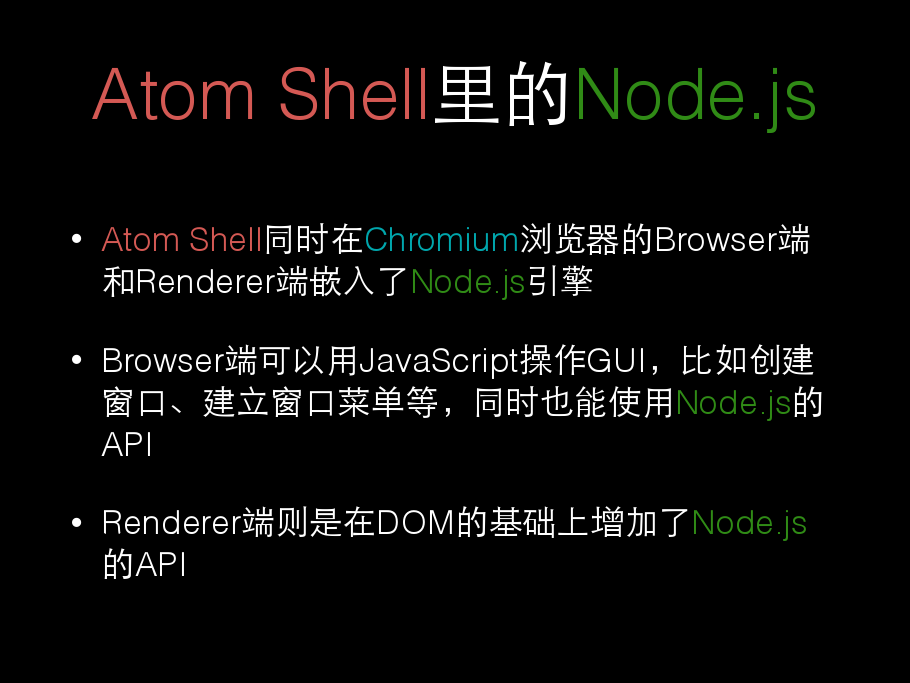 • Atom Shell同时在Chromium浏览器的Browser端 和Renderer端嵌⼊入了Node.js引擎