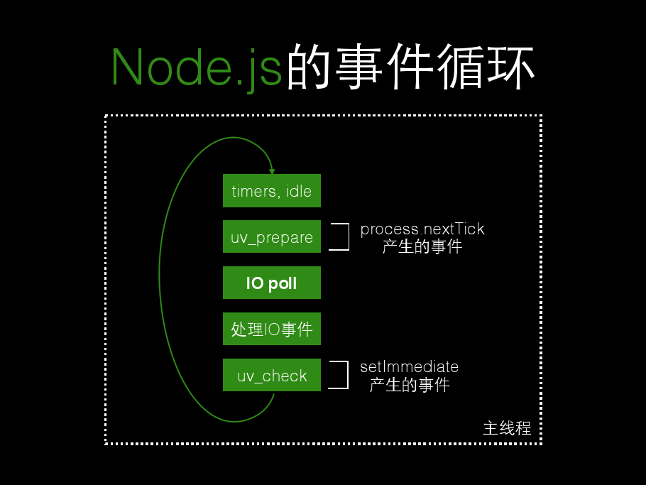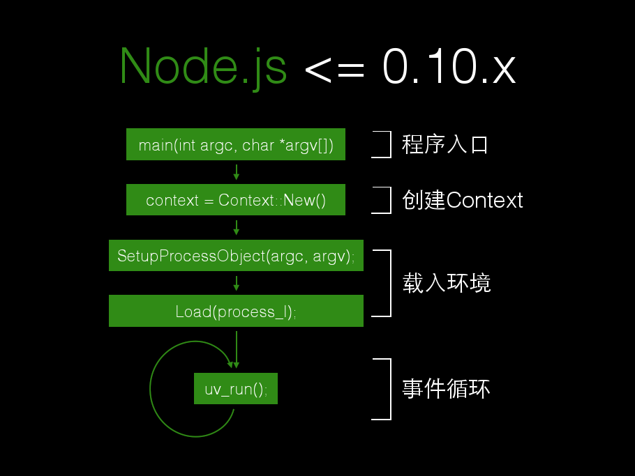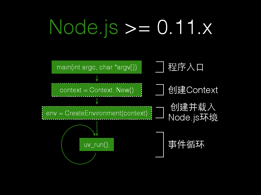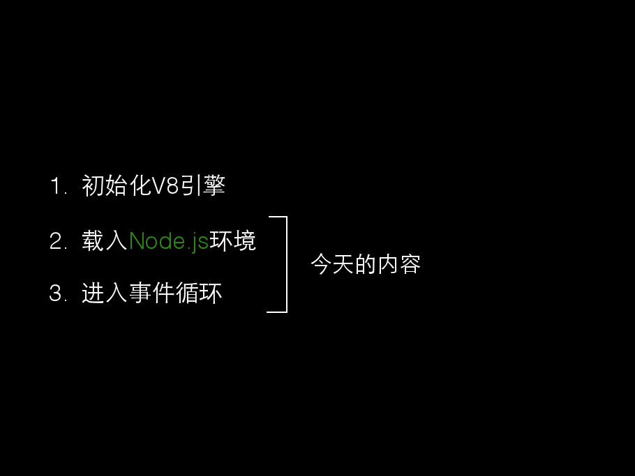 1. 初始化V8引擎 2. 载⼊入Node.js环境 3. 进⼊入事件循环
