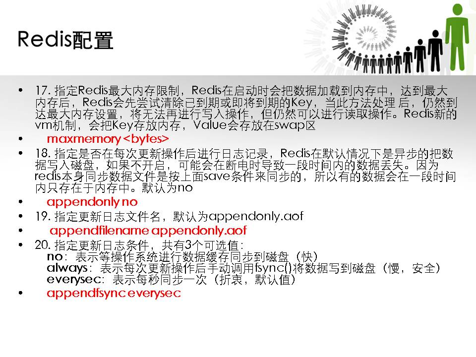 20. 指定更新日志条件,共有3个可选值: no:表示等操作系统进行数据缓存同步到磁盘(快) always:表示每次更新操作后手动调用fsync()将数据写到磁盘(慢,安全) everysec:表示每秒同步一次(折衷,默认值)