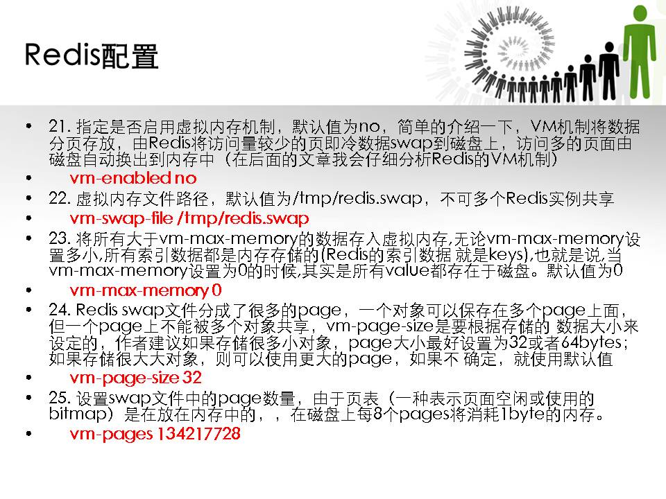 21. 指定是否启用虚拟内存机制,默认值为no,简单的介绍一下,VM机制将数据分页存放,由Redis将访问量较少的页即冷数据swap到磁盘上,访问多的页面由磁盘自动换出到内存中(在后面的文章我会仔细分析Redis的VM机制)