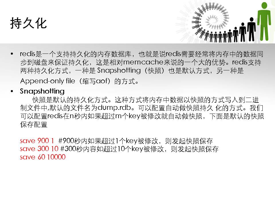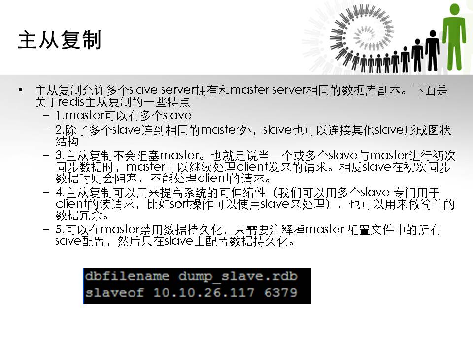 4.主从复制可以用来提高系统的可伸缩性(我们可以用多个slave 专门用于client的读请求,比如sort操作可以使用slave来处理),也可以用来做简单的数据冗余。