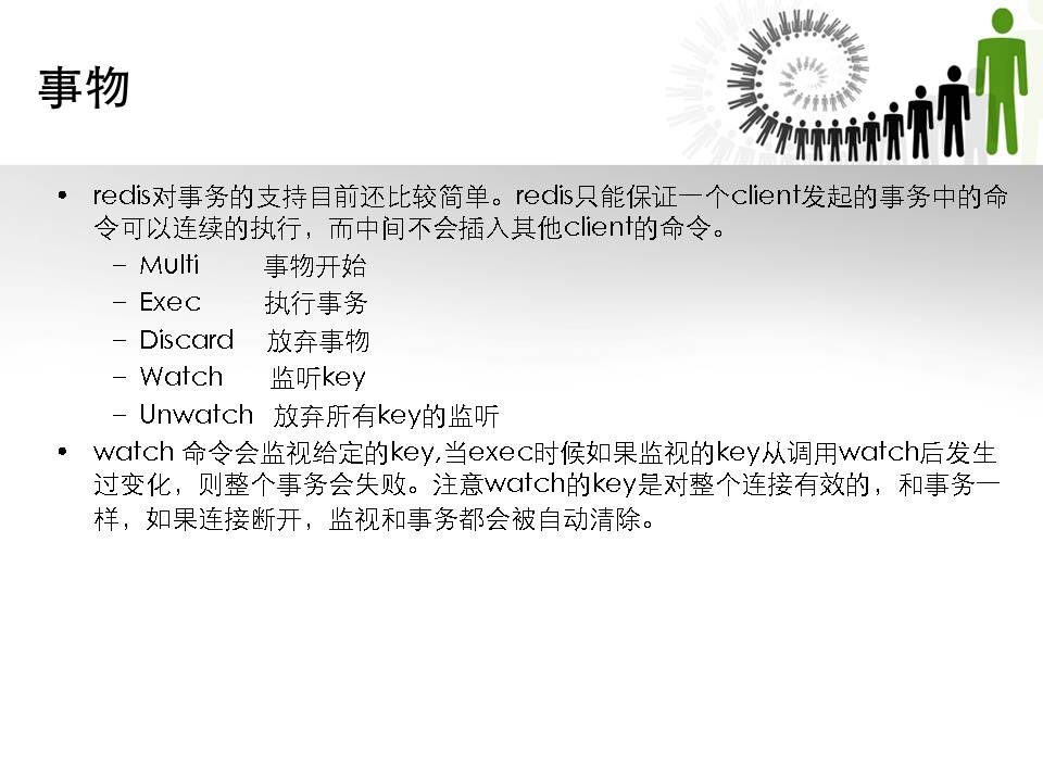 redis对事务的支持目前还比较简单。redis只能保证一个client发起的事务中的命令可以连续的执行,而中间不会插入其他client的命令。
