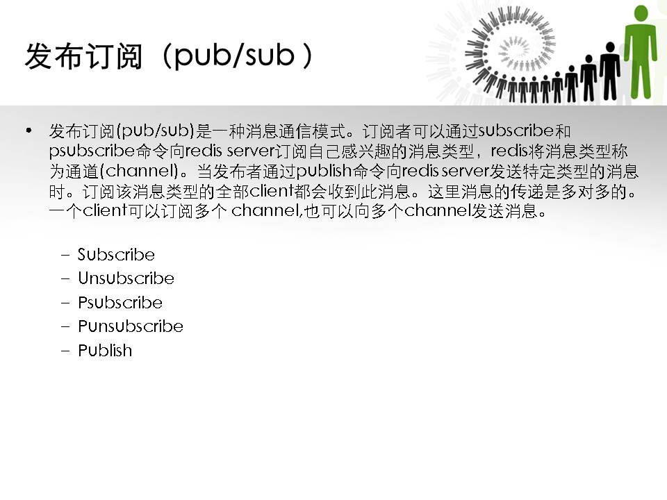 发布订阅(pub/sub)是一种消息通信模式。订阅者可以通过subscribe和psubscribe命令向redis server订阅自己感兴趣的消息类型,redis将消息类型称为通道(channel)。当发布者通过publish命令向redis server发送特定类型的消息时。订阅该消息类型的全部client都会收到此消息。这里消息的传递是多对多的。一个client可以订阅多个 channel,也可以向多个channel发送消息。