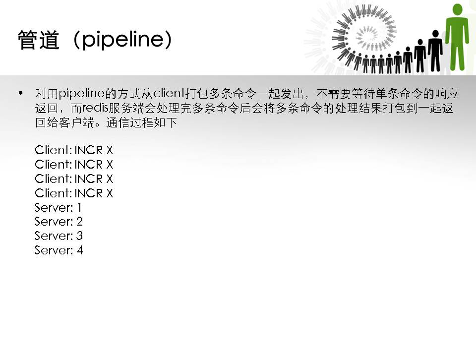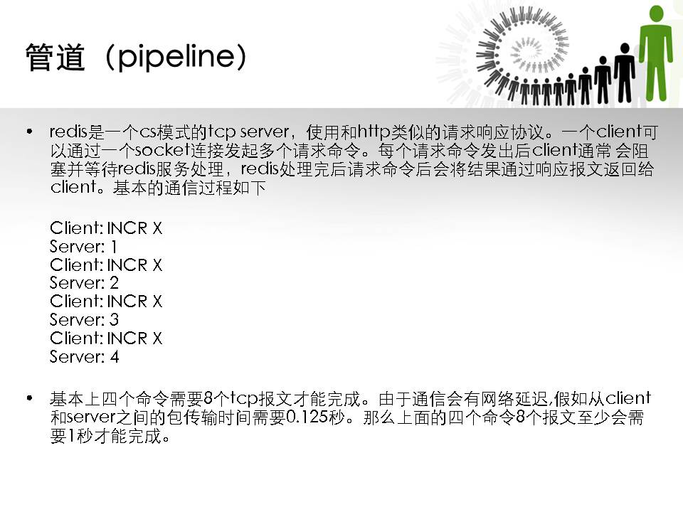 利用pipeline的方式从client打包多条命令一起发出,不需要等待单条命令的响应返回,而redis服务端会处理完多条命令后会将多条命令的处理结果打包到一起返回给客户端。通信过程如下Client: INCR XClient: INCR XClient: INCR XClient: INCR XServer: 1Server: 2Server: 3Server: 4
