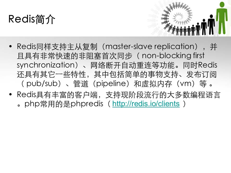 Redis同样支持主从复制(master-slave replication),并且具有非常快速的非阻塞首次同步( non-blocking first synchronization)、网络断开自动重连等功能。同时Redis还具有其它一些特性,其中包括简单的事物支持、发布订阅 ( pub/sub)、管道(pipeline)和虚拟内存(vm)等 。