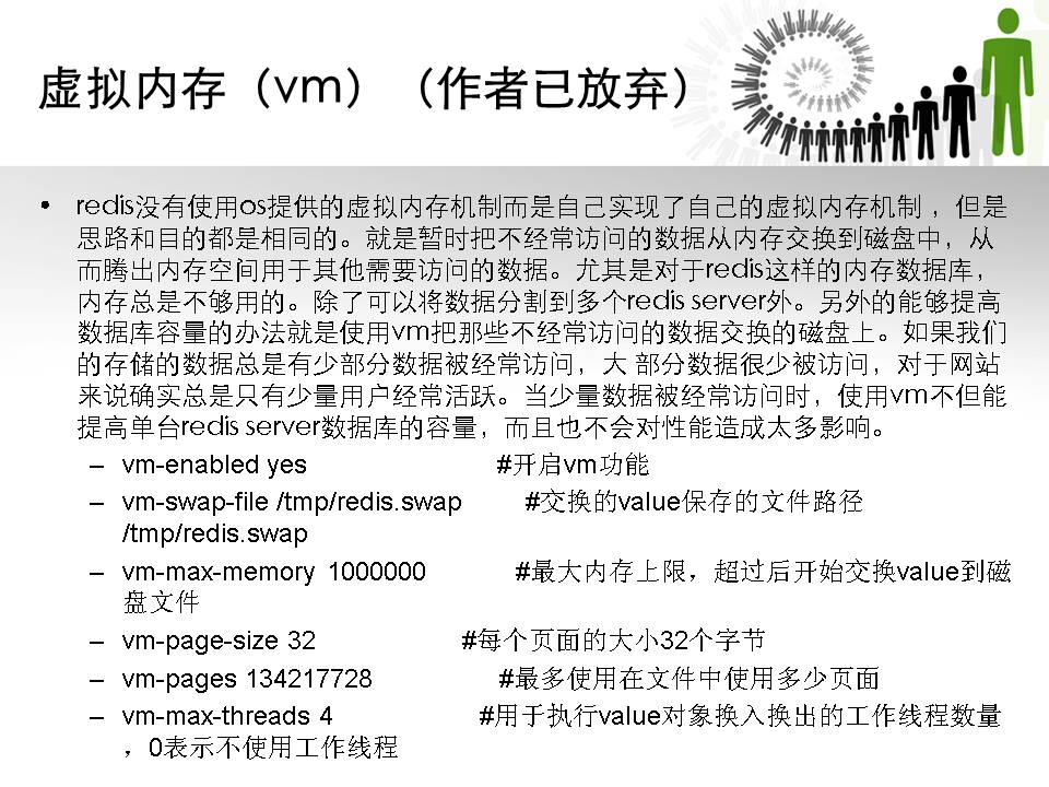 redis没有使用os提供的虚拟内存机制而是自己实现了自己的虚拟内存机制 ,但是思路和目的都是相同的。就是暂时把不经常访问的数据从内存交换到磁盘中,从而腾出内存空间用于其他需要访问的数据。尤其是对于redis这样的内存数据库,内存总是不够用的。除了可以将数据分割到多个redis server外。另外的能够提高数据库容量的办法就是使用vm把那些不经常访问的数据交换的磁盘上。如果我们的存储的数据总是有少部分数据被经常访问,大 部分数据很少被访问,对于网站来说确实总是只有少量用户经常活跃。当少量数据被经常访问时,使用vm不但能提高单台redis server数据库的容量,而且也不会对性能造成太多影响。