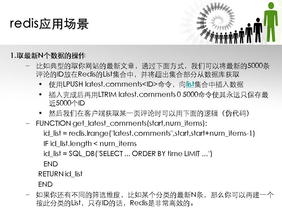 比如典型的取你网站的最新文章,通过下面方式,我们可以将最新的5000条评论的ID放在Redis的List集合中,并将超出集合部分从数据库获取