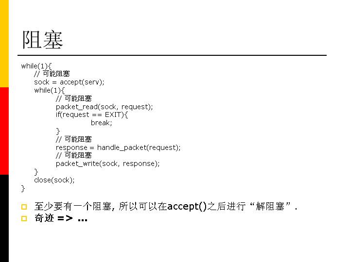 至少要有一个阻塞, 所以可以在accept()之后进行“解阻塞”.