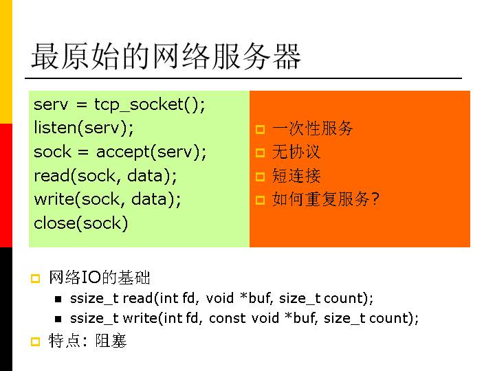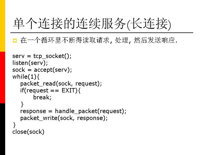 缺点: 必须等一个连接关闭或者退出后, 才能处理下一个连接, 不是并发服务器.