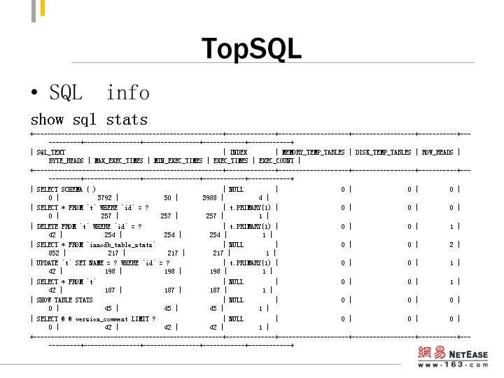 | SQL_TEXT | INDEX | MEMORY_TEMP_TABLES | DISK_TEMP_TABLES | ROW_READS | BYTE_READS | MAX_EXEC_TIMES | MIN_EXEC_TIMES | EXEC_TIMES | EXEC_COUNT |