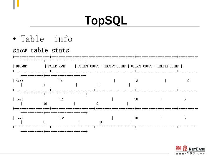 | DBNAME | TABLE_NAME | SELECT_COUNT | INSERT_COUNT | UPDATE_COUNT | DELETE_COUNT |