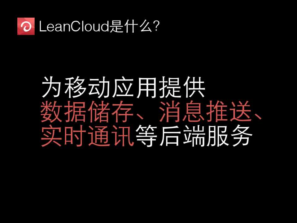 为移动应⽤用提供 数据储存、消息推送、 实时通讯等后端服务