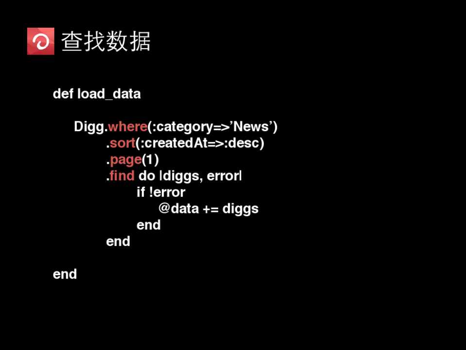 Digg.where(:category=>’News’) .sort(:createdAt=>:desc) .page(1) .find do |diggs, error| if !error @data += diggs end end