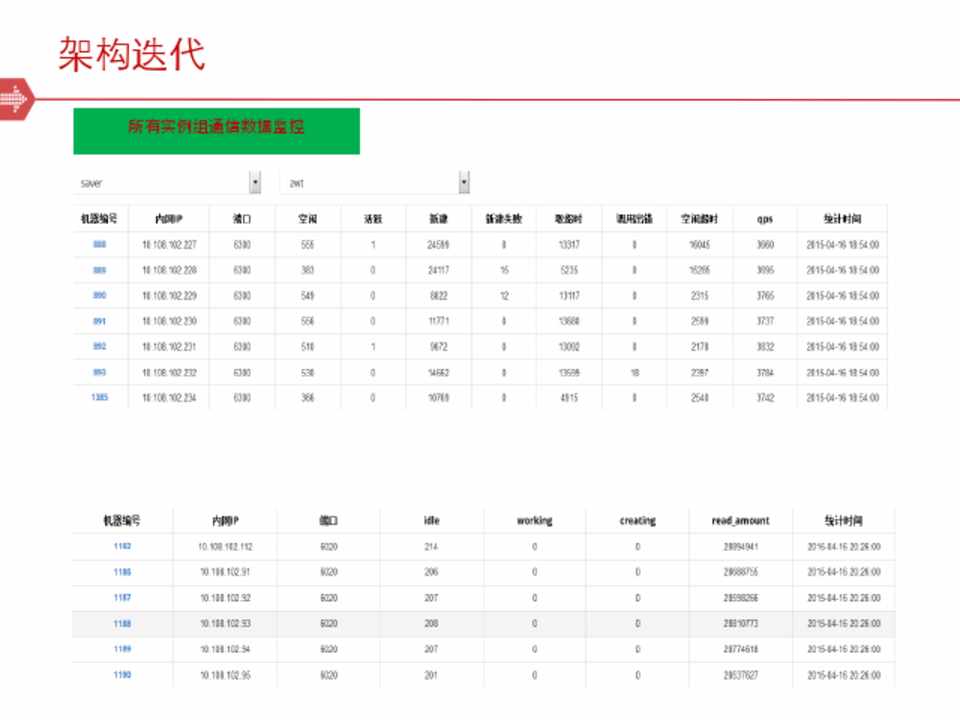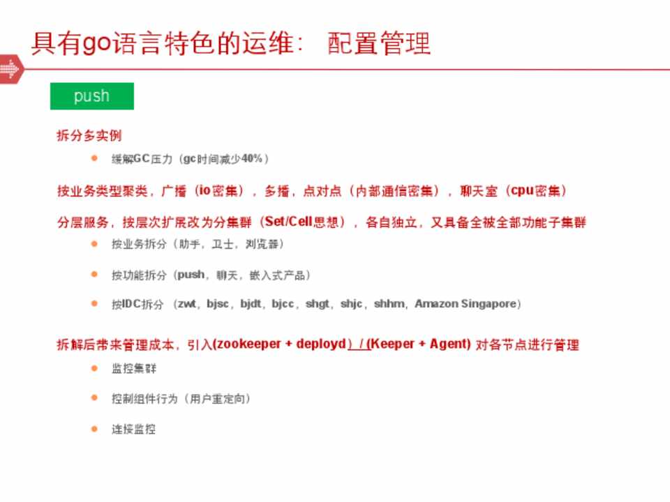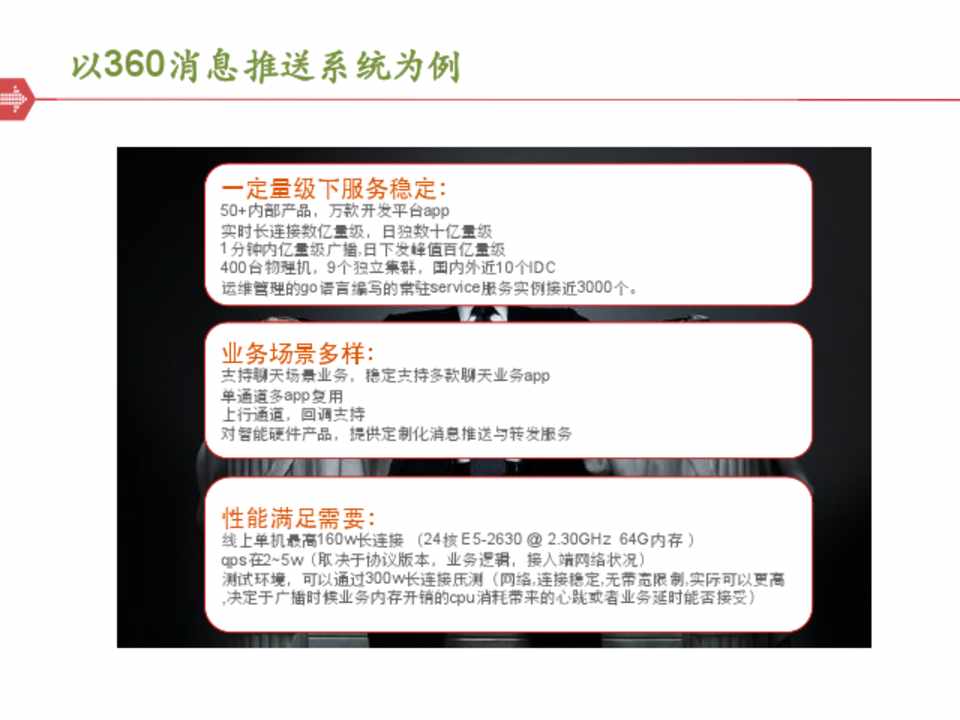 50+内部产品,万款开发平台app 实时⻓长连接数亿量级,⽇日独数⼗十亿量级 1分钟内亿量级⼲⼴广播,⽇日下发峰值百亿量级 400台物理机,9个独⽴立集群,国内外近10个IDC 运维管理的go语⾔言编写的常驻service服务实例接近3000个。