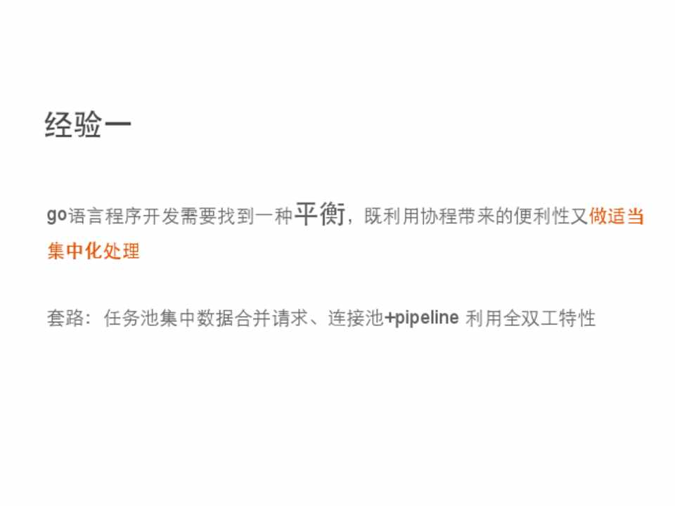 go语⾔言程序开发需要找到⼀一种平衡,既利⽤用协程带来的便利性⼜又做适当集中化处理 套路 = 按请求和业务逻辑并⾏行+任务池集中数据合并请求 + 连接池集中收发