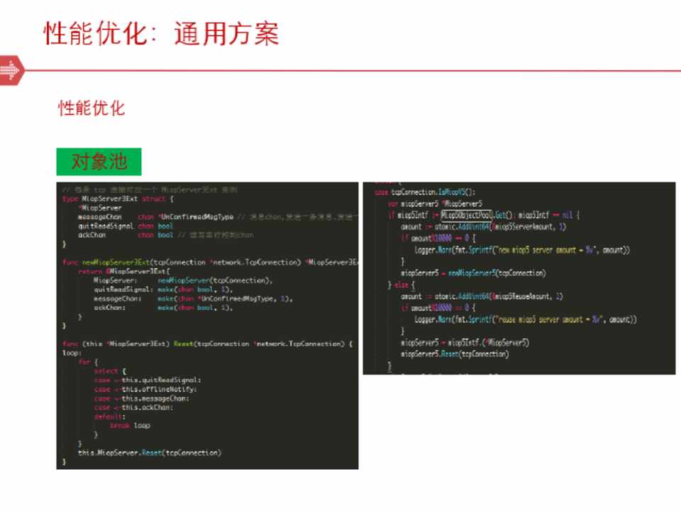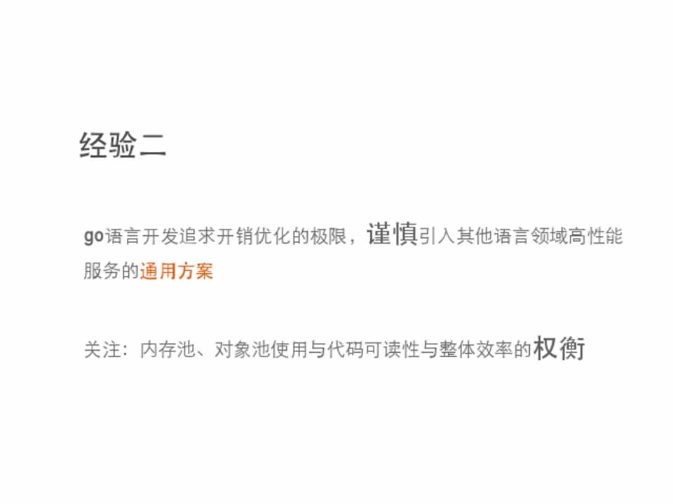 go语⾔言开发追求开销优化的极限,谨慎引⼊入其他语⾔言领域⾼高性能服务的通⽤用⽅方案 内存池+对象池使⽤用 与 代码可读性与整体效率的权衡