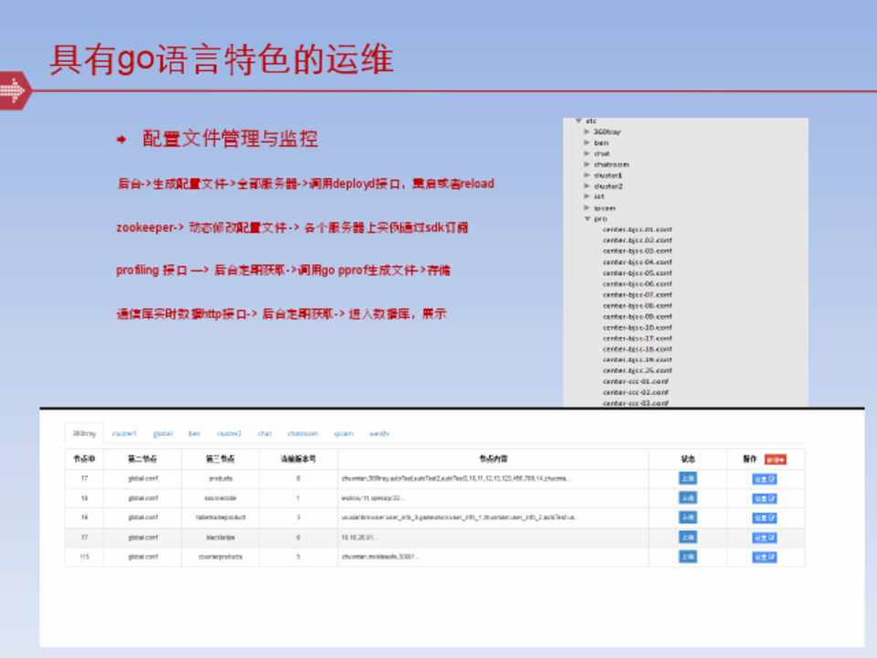 后台->⽣生成配置⽂文件->全部服务器->调⽤用deployd接⼝口,重启或者reload zookeeper-> 动态修改配置⽂文件 -> 各个服务器上实例通过sdk订阅 profiling 接⼝口 —> 后台定期获取->调⽤用go pprof⽣生成⽂文件->存储 通信库实时数据http接⼝口-> 后台定期获取-> 进⼊入数据库,展⽰示