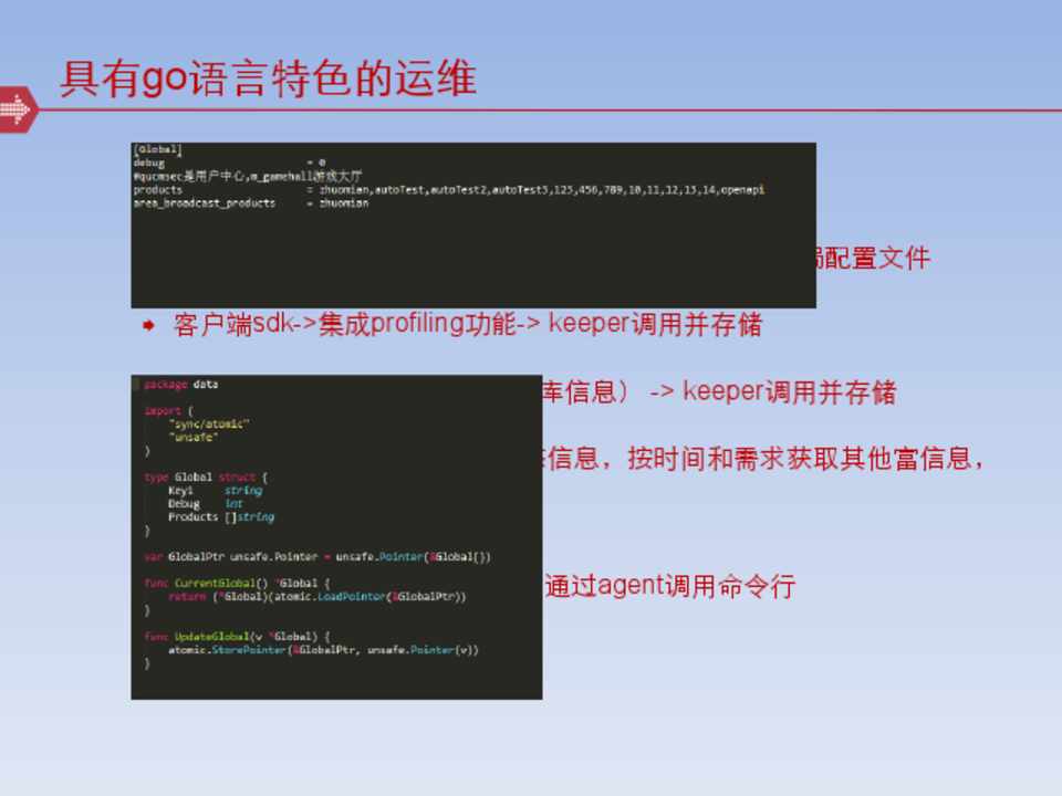 Æ ⼯工具 -> ⽣生成项⺫⽬目公共⽂文件夹下的.go 配置⽂文件 Æ 客户端sdk -> keeper通信 告知⾝身份-> 原⼦子性的换掉全局配置⽂文件 Æ 客户端sdk->集成profiling功能-> keeper调⽤用并存储 Æ 客户端sdk-> ⾃自定义信息(通信库信息) -> keeper调⽤用并存储 Æ keeper本地保持所有客户端状态信息,按时间和需求获取其他富信息,