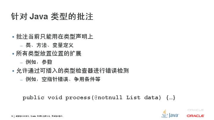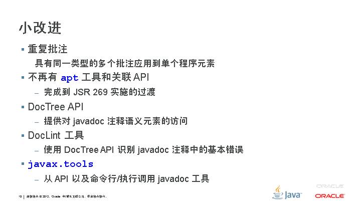 重复批注 具有同一类型的多个批注应用到单个程序元素 不再有 apt 工具和关联 API 完成到 JSR 269 实施的过渡 DocTree API 提供对 javadoc 注释语义元素的访问 DocLint 工具 使用 DocTree API 识别 javadoc 注释中的基本错误 javax.tools 从 API 以及命令行/执行调用 javadoc 工具