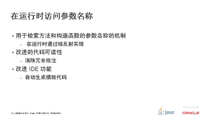 用于检索方法和构造函数的参数名称的机制 在运行时通过核反射实现 改进的代码可读性 消除冗余批注 改进 IDE 功能 自动生成模板代码
