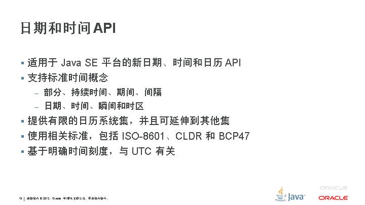 适用于 Java SE 平台的新日期、时间和日历 API 支持标准时间概念 部分、持续时间、期间、间隔 日期、时间、瞬间和时区 提供有限的日历系统集,并且可延伸到其他集 使用相关标准,包括 ISO-8601、CLDR 和 BCP47 基于明确时间刻度,与 UTC 有关