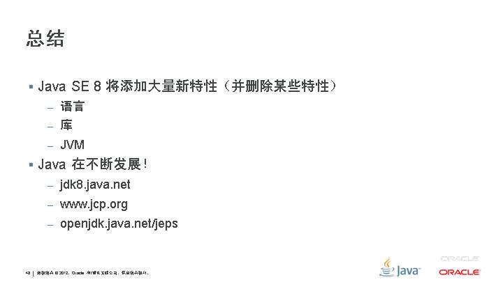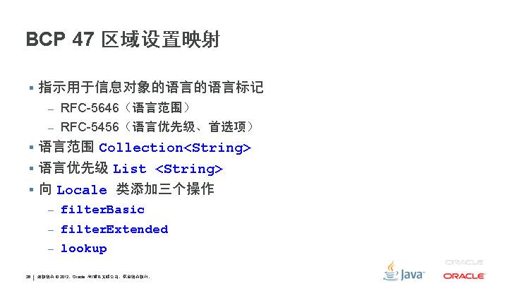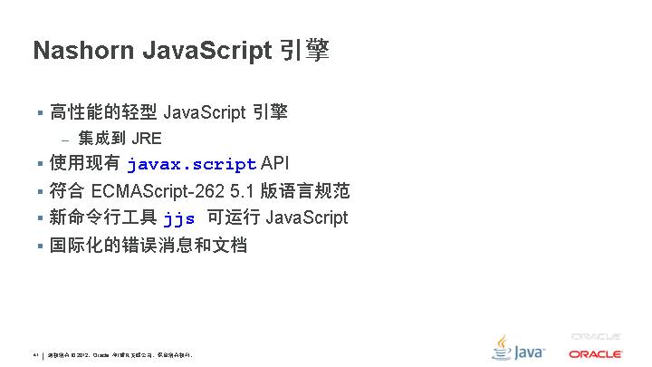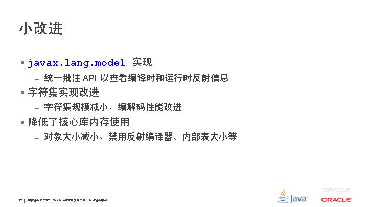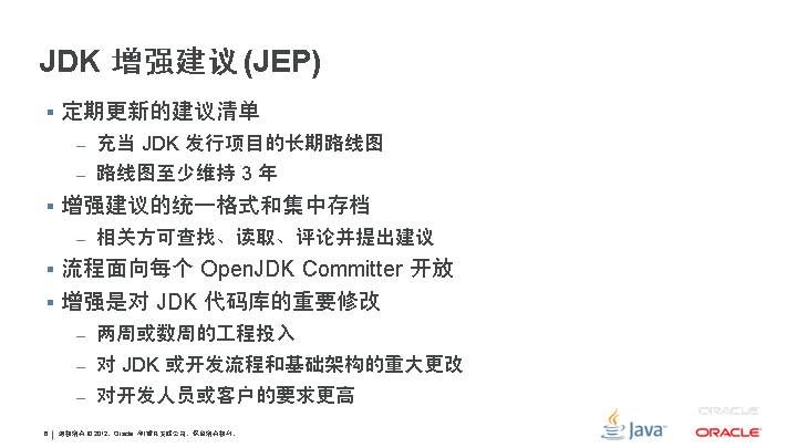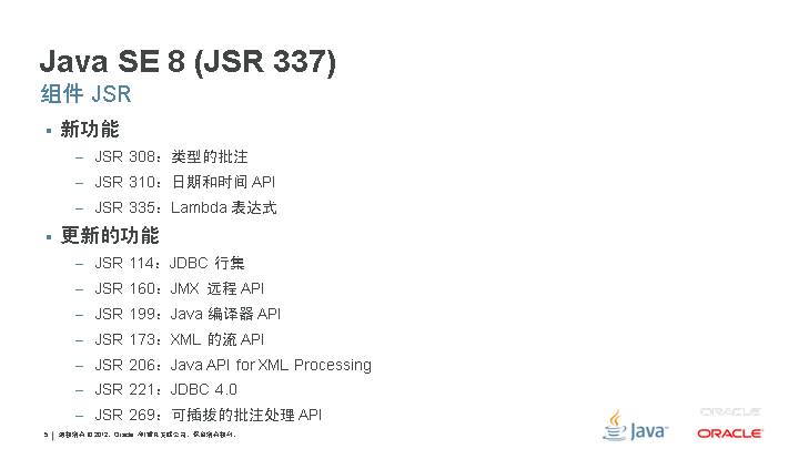 新功能 JSR 308:类型的批注 JSR 310:日期和时间 API JSR 335:Lambda 表达式 更新的功能 JSR 114:JDBC 行集 JSR 160:JMX 远程 API JSR 199:Java 编译器 API JSR 173:XML 的流 API JSR 206:Java API for XML Processing JSR 221:JDBC 4.0 JSR 269:可插拔的批注处理 API