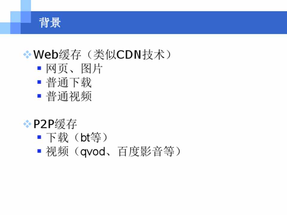 vWeb缓存(类似CDN技术) § 网页、图片 § 普通下载 § 普通视频