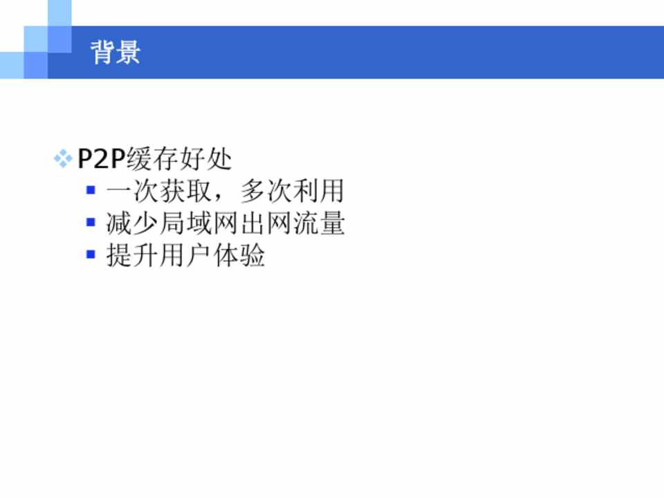vP2P缓存好处 § 一次获取,多次利用 § 减少局域网出网流量 § 提升用户体验