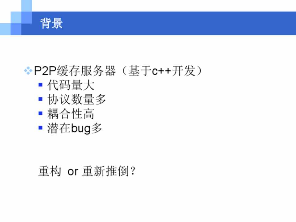 vP2P缓存服务器(基于c++开发) § 代码量大 § 协议数量多 § 耦合性高 § 潜在bug多
