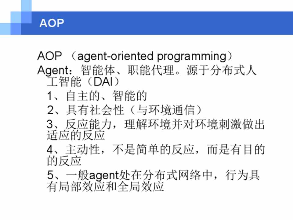 AOP (agent-oriented programming) Agent:智能体、职能代理。源于分布式人