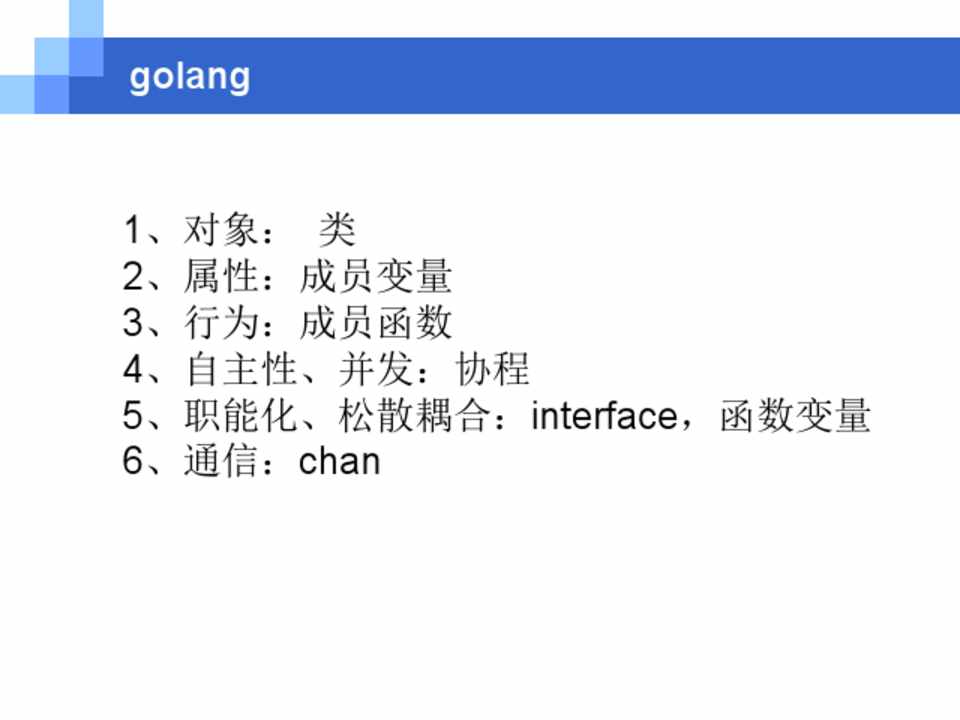 1、对象: 类 2、属性:成员变量 3、行为:成员函数 4、自主性、并发:协程 5、职能化、松散耦合:interface,函数变量 6、通信:chan