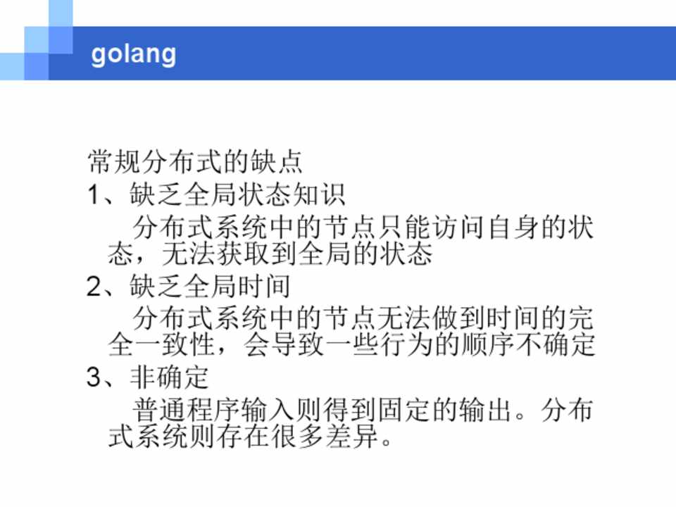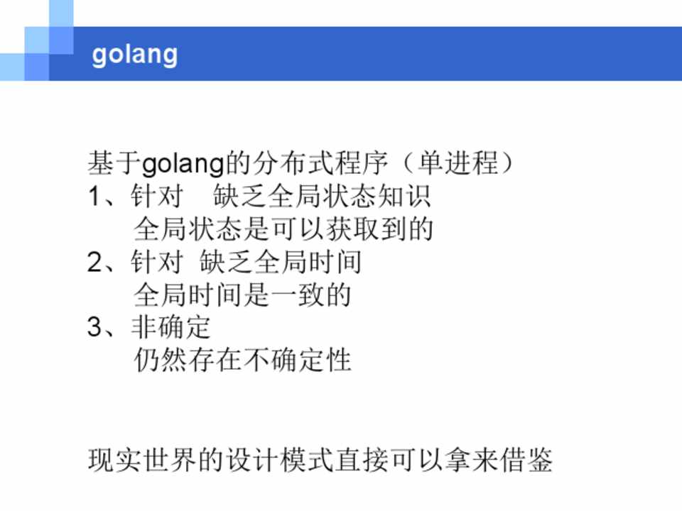 基于golang的分布式程序(单进程) 1、针对 缺乏全局状态知识
