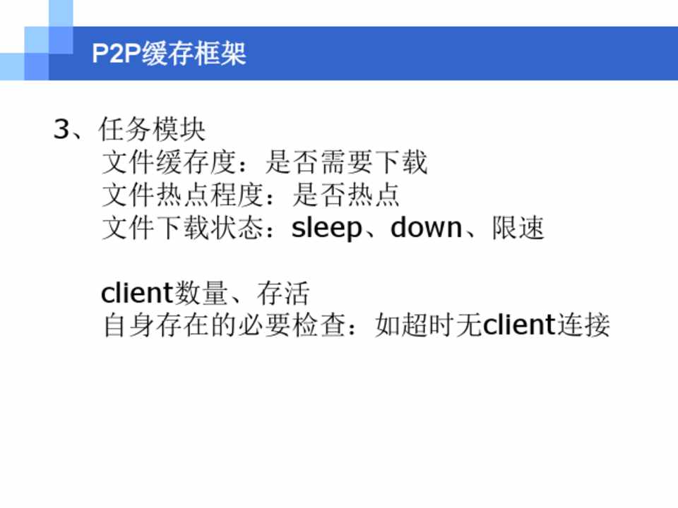3、任务模块 文件缓存度:是否需要下载 文件热点程度:是否热点 文件下载状态:sleep、down、限速