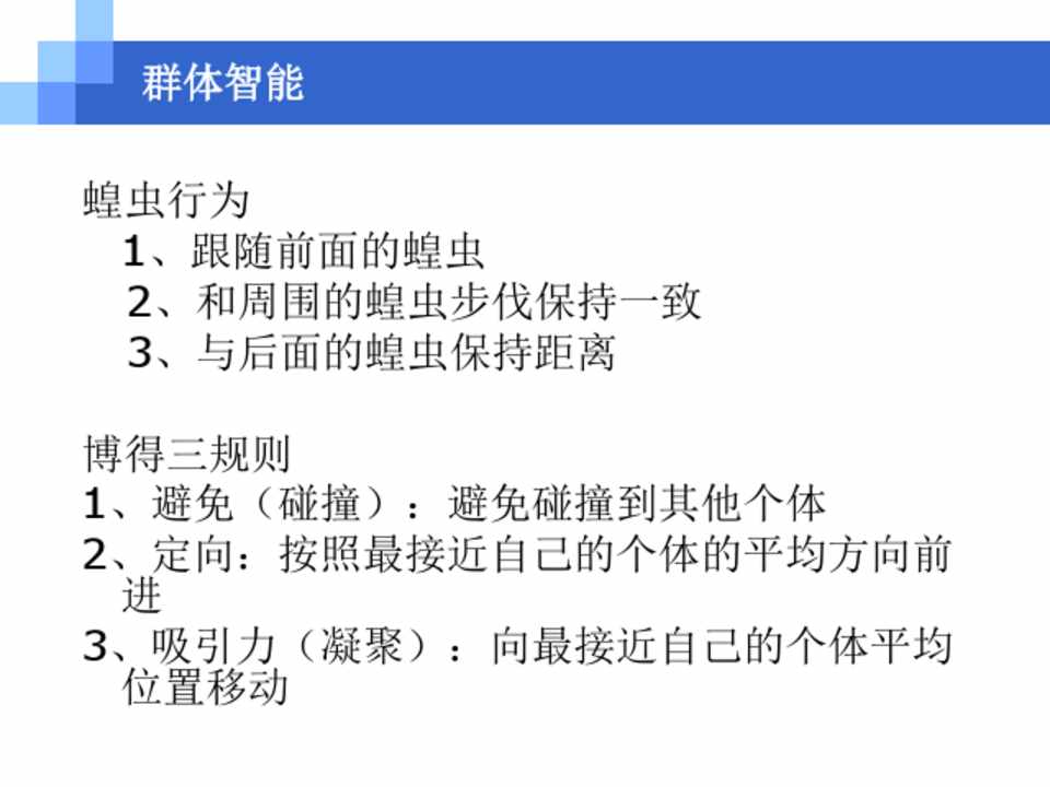 蝗虫行为 1、跟随前面的蝗虫 2、和周围的蝗虫步伐保持一致 3、与后面的蝗虫保持距离