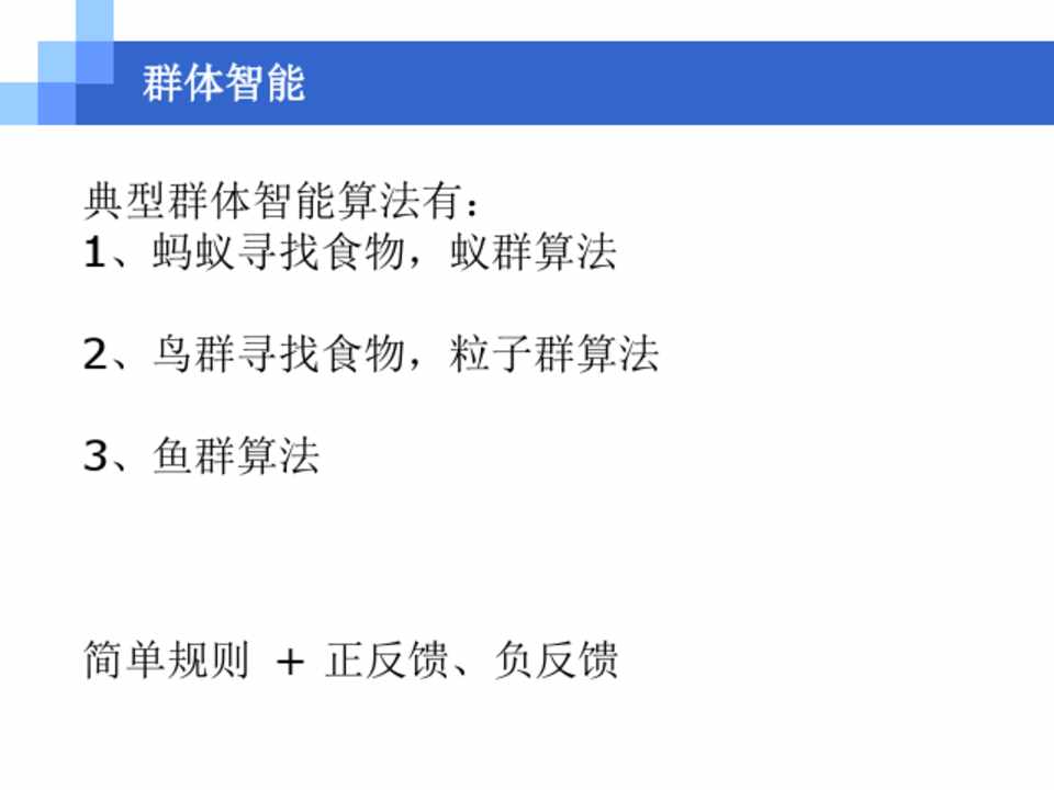 群体智能 典型群体智能算法有: 1、蚂蚁寻找食物,蚁群算法 2、鸟群寻找食物,粒子群算法 3、鱼群算法