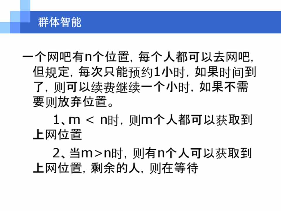 一个网吧有n个位置,每个人都可以去网吧, 但规定,每次只能预约1小时,如果时间到 了,则可以续费继续一个小时,如果不需 要则放弃位置。