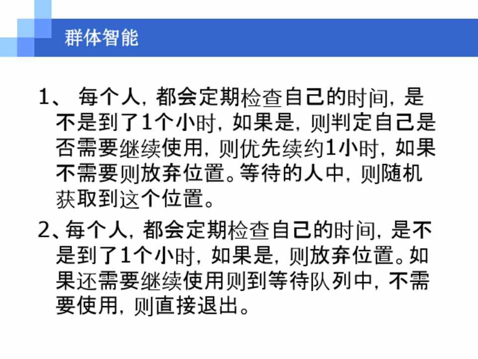 1、 每个人,都会定期检查自己的时间,是 不是到了1个小时,如果是,则判定自己是 否需要继续使用,则优先续约1小时,如果 不需要则放弃位置。等待的人中,则随机 获取到这个位置。