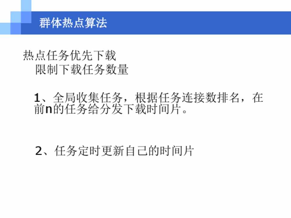 热点任务优先下载 限制下载任务数量 1、全局收集任务,根据任务连接数排名,在 前n的任务给分发下载时间片。